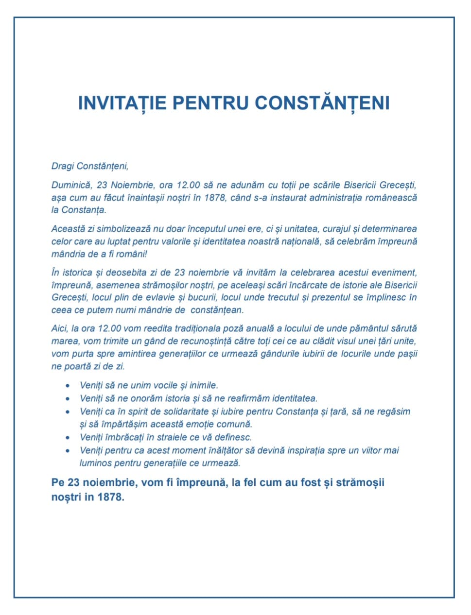 Veniți pentru ca acest moment înălțător să devină inspirația spre un viitor mai luminos pentru generațiile ce urmează.”, se arată în invitația transmisă constănțenilor de Anton Antoniadis.