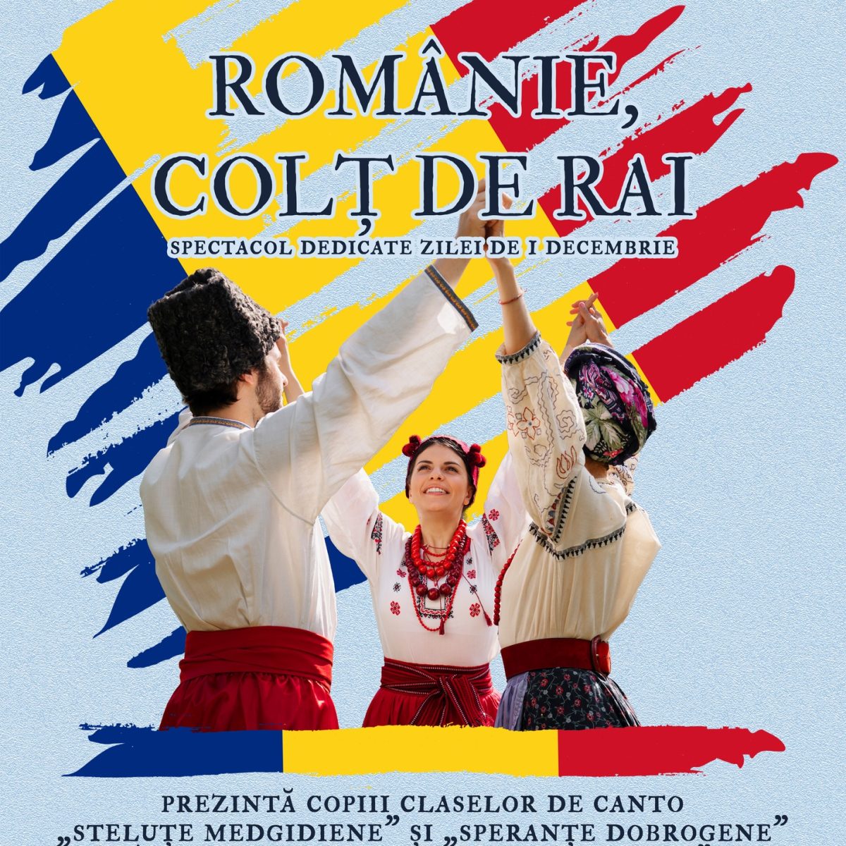 Elevii claselor de canto din Medgidia și Ansamblul „Pandelașul” invită publicul iubitor de folclor la un eveniment dedicat Zilei Naționale a României.