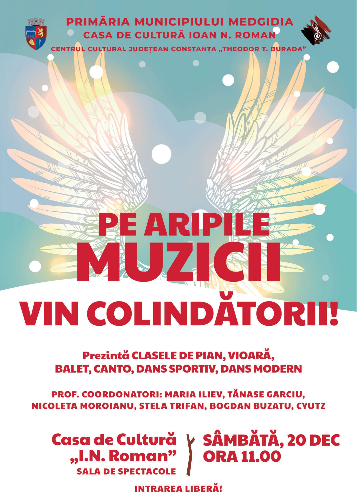 Micii colindători ai Casei de Cultură „I. N. Roman” au adus mai aproape bucuria Crăciunului și farmecul iernii prin momente artistice pregătite cu drag pentru publicul spectator. Cântece, dansuri, balet, recitaluri de pian și vioară, pe scurt o feerie artistică ce i-a încântat pe toți cei prezenți în sala de spectacole. La spectacolul desfășurat sâmbătă, 20 decembrie, începând cu ora 11.00, au participat copiii din clasele de pian, vioară, balet, canto și dans ale Casei de Cultură ,,Ioan N. Roman” din municipiul Medgidia. Momentele artistice au purtat amprenta profesorilor coordonatori: Maria Iliev, Tănase Garciu, Nicoleta Moroianu, Stela Trifan, Bogdan Buzatu și Cyutz.