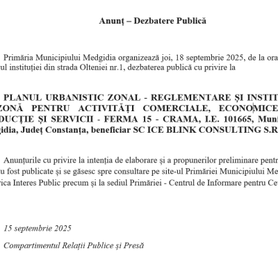 Primăria Municipiului Medgidia organizează joi, 18 septembrie 2025, de la ora 12.30, la sediul instituției din strada Olteniei nr.1, dezbaterea publică cu privire